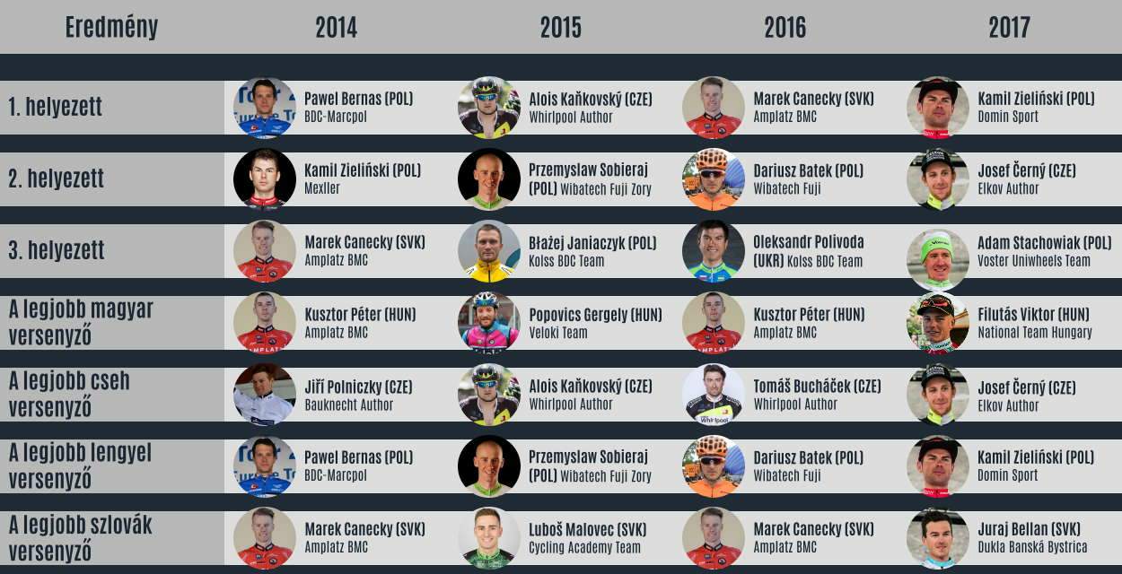 Ahogy minden évben, úgy idén is nyolc fontos díj talál gazdára a V4 Kerékpárverseny magyar szakaszán. Az első három helyezett mellett ugyanis a legjobb cseh, lengyel, magyar és szlovák versenyző is díjban részesül, valamint a Visegrád 4 versenyek összetett győztesének járó sárga trikó is kiosztásra kerül. Az elmúlt években tizenheten állhattak dobogóra hazánkban, kíváncsian várjuk, hogy idén vajon kik csatlakoznak hozzájuk.